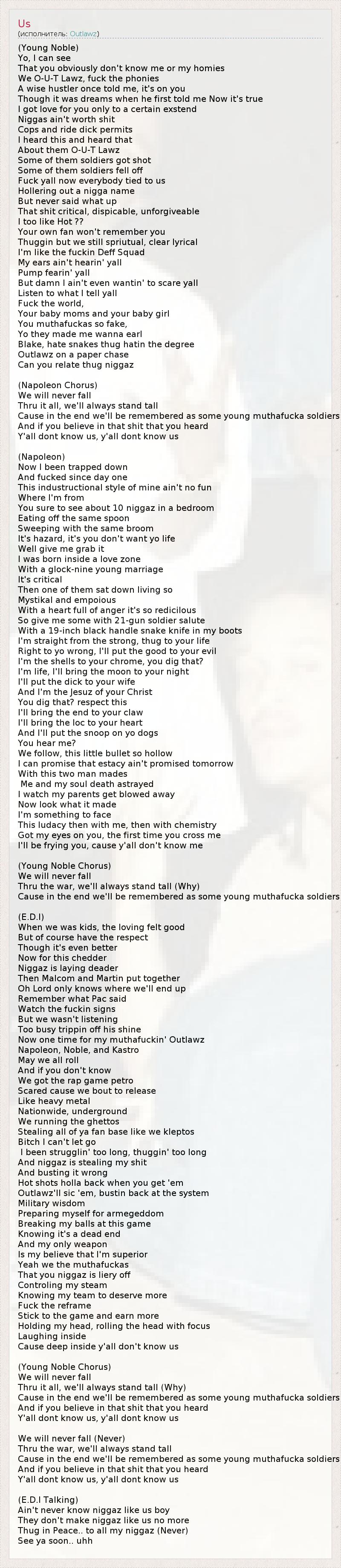 Это интересно:Группа Outlawz (“Беззаконники”) была создана под покровительством Тупака Шакура. Впервые некоторые будущие участники Outlawz появились в саундтрэке к фильму “Above the Rim”, как группа Thug Life. Тогда она состояла из: Macodoshis, The Rated R, Big Syke, и Mopreme. Последний, к слову, являлся Тупаку сводным братом. Впоследствии только он и Большой Сайк присоединились к Outlawz Immortalz. Затем, в третьем сольном... продолжение