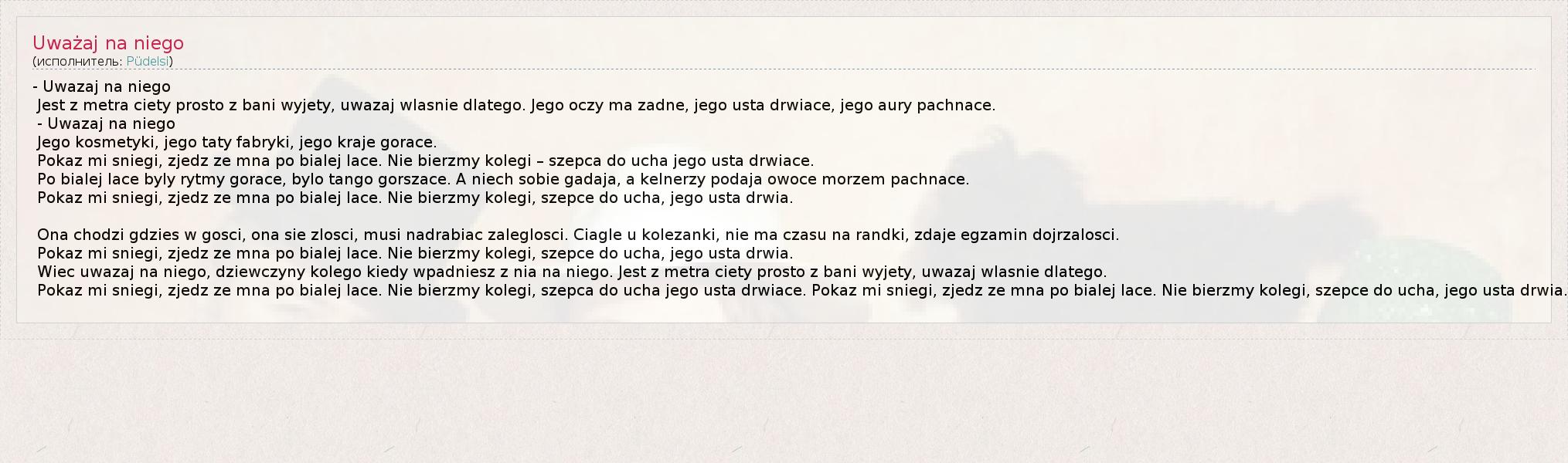 - Uwazaj na niego Jest z metra ciety prosto z bani wyjety, uwazaj wlasnie dlatego. Jego oczy ma zadne, jego usta drwiace, jego aury pachnace. - Uwazaj na niego Jego kosmetyki, jego taty fabryki, jego kraje gorace. Pokaz mi sniegi, zjedz ze mna po bialej lace. Nie bierzmy kolegi – szepca do ucha jego usta drwiace. Po bialej lace byly rytmy gorace, bylo tango gorszace. A niech sobie gadaja, a kelnerzy podaja owoce morzem pachnace. Pokaz mi sniegi, zjedz ze mna po bialej lace. Nie bierzmy kolegi, szepce do ucha, jego usta drwia. Ona chodzi gdzies w gosci, ona sie zlosci, musi nadrabiac zaleglosci. Ciagle u kolezanki, nie ma czasu na randki, zdaje egzamin dojrzalosci. Pokaz mi sniegi, zjedz ze mna po bialej lace. Nie bierzmy kolegi, szepce do ucha, jego usta drwia. Wiec uwazaj na niego, dziewczyny kolego kiedy wpadniesz z nia na niego. Jest z metra ciety prosto z bani wyjety, uwazaj wlasnie dlatego. Pokaz mi sniegi, zjedz ze mna po bialej lace. Nie bierzmy kolegi, szepca do ucha jego usta drwiace. Pokaz mi sniegi, zjedz ze mna po bialej lace. Nie bierzmy kolegi, szepce do ucha, jego usta drwia.