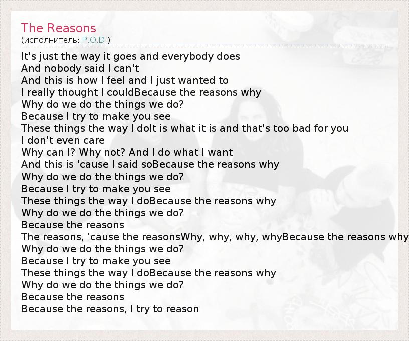 The reasons, 'cause the reasonsWhy, why, why, whyBecause the reasons why