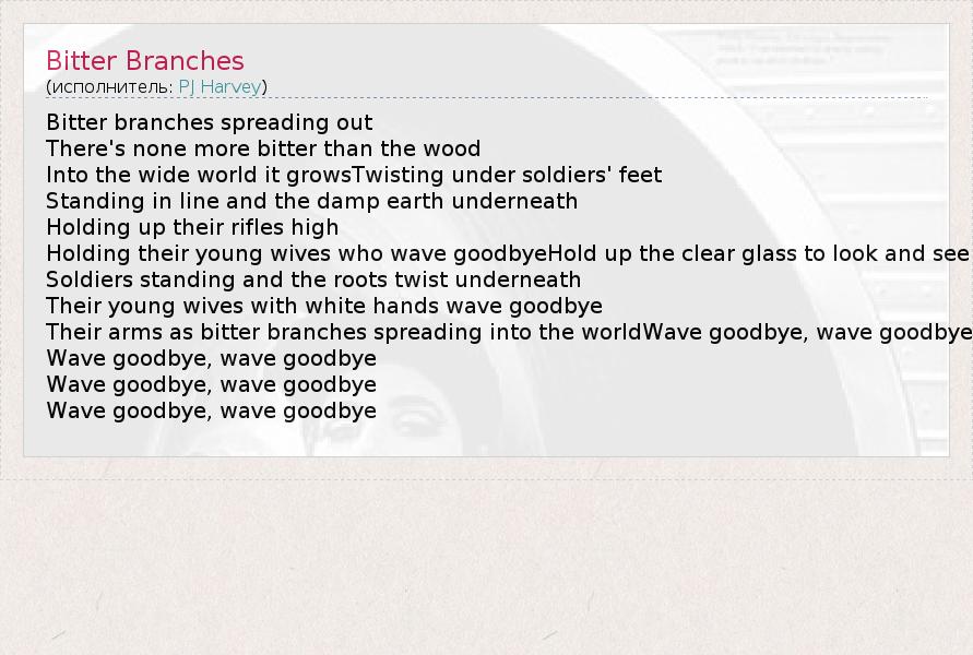 Bitter branches spreading out There's none more bitter than the wood Into the wide world it growsTwisting under soldiers' feet Standing in line and the damp earth underneath Holding up their rifles high Holding their young wives who wave goodbyeHold up the clear glass to look and see Soldiers standing and the roots twist underneath Their young wives with white hands wave goodbye Their arms as bitter branches spreading into the worldWave goodbye, wave goodbye Wave goodbye, wave goodbye Wave goodbye, wave goodbye Wave goodbye, wave goodbye