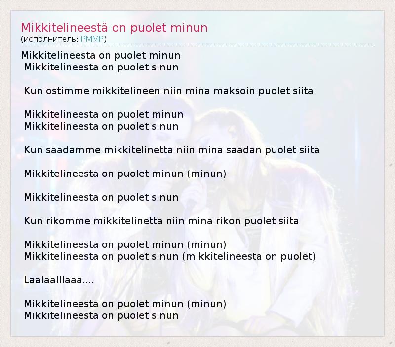 А как ты думаешь, о чем песня "Mikkitelineestä on puolet minun" ?