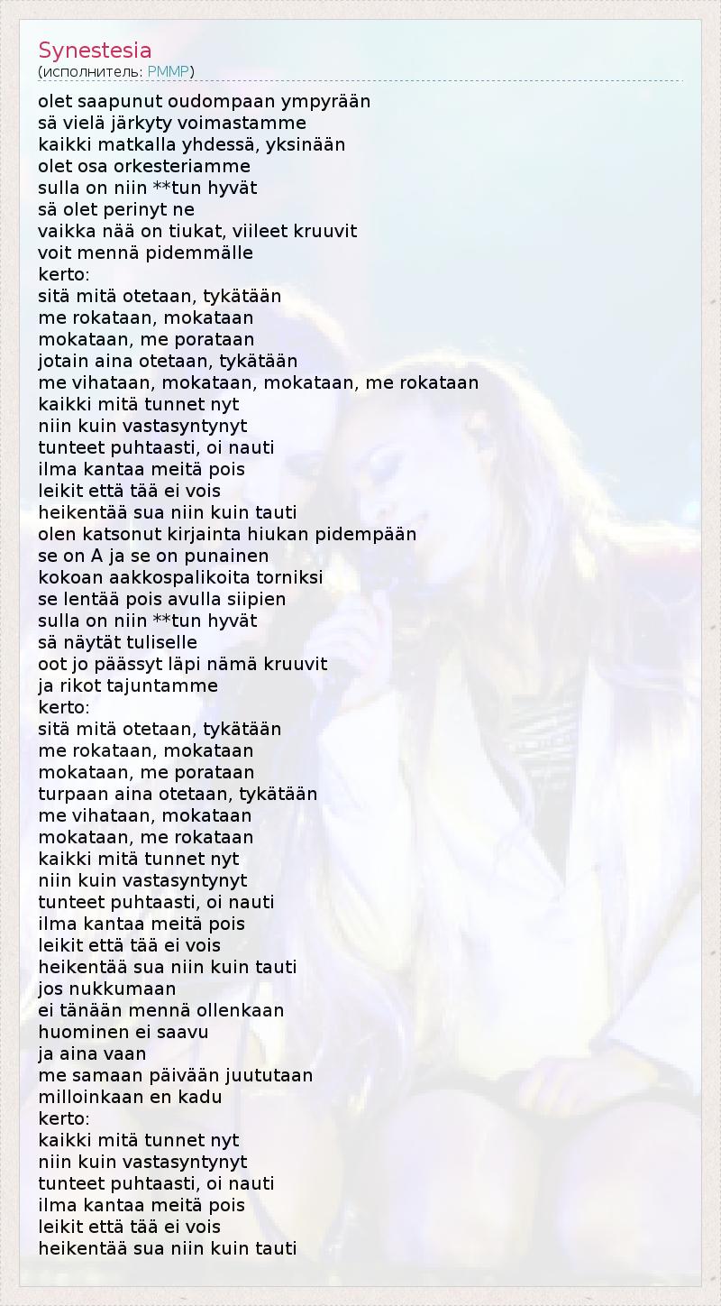 Это интересно:РММР — финская поп-рок группа. Состоит из двух вокалисток (Паула Весала и Мира Луоти, которые являются ядром группы), и трех музыкантов. Группа образована в Хельсинки в конце 2002 года. РММР выпустили 3 альбома, 10 синглов и 7 видео-клипов. Тексты к песням написаны вокалистками группы, а музыка — Йори Сьёроосом, продюсером группы. Абсолютно все песни РММР написаны на финском языке.Название... продолжение