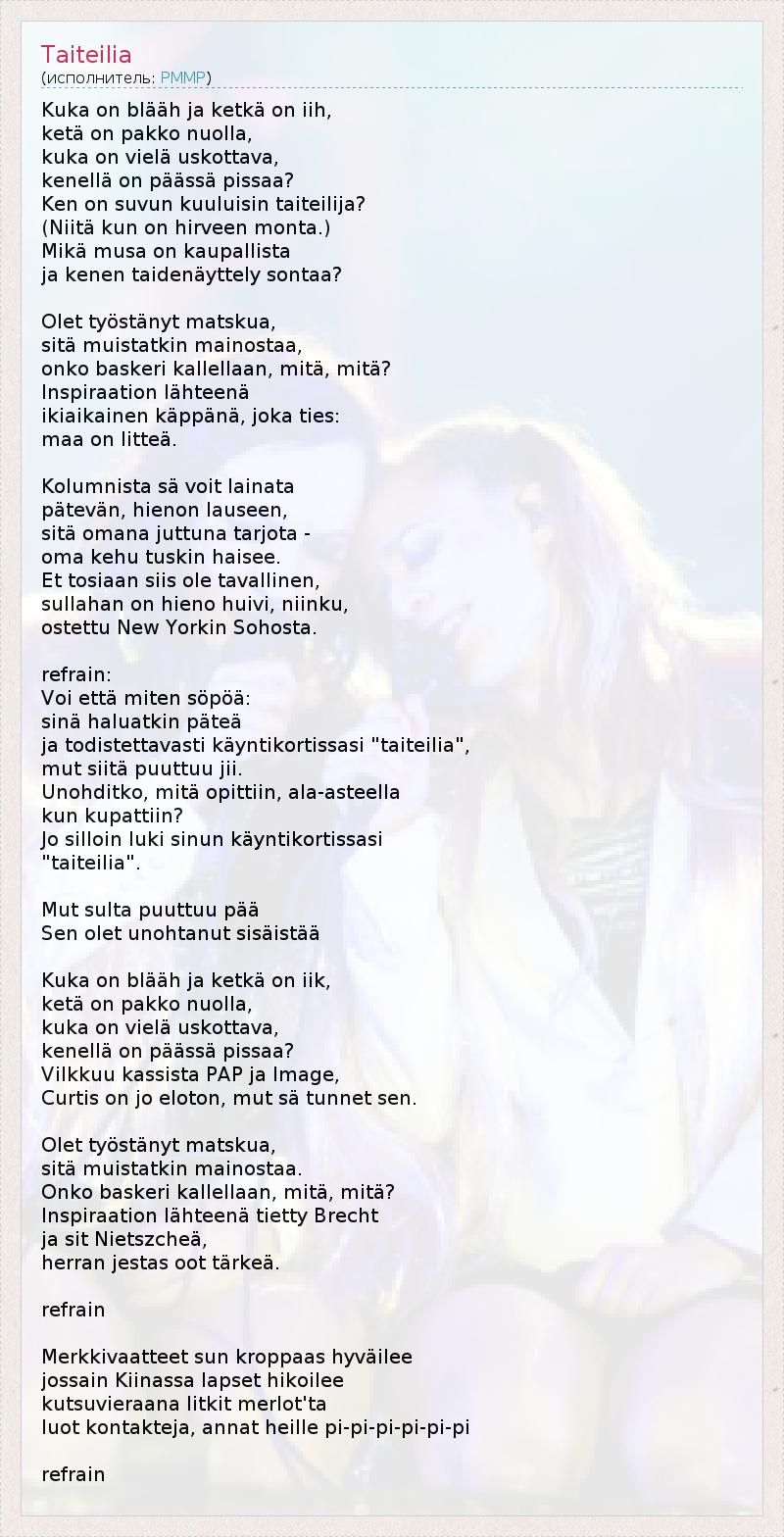 А как ты думаешь, о чем песня "Taiteilia" ?