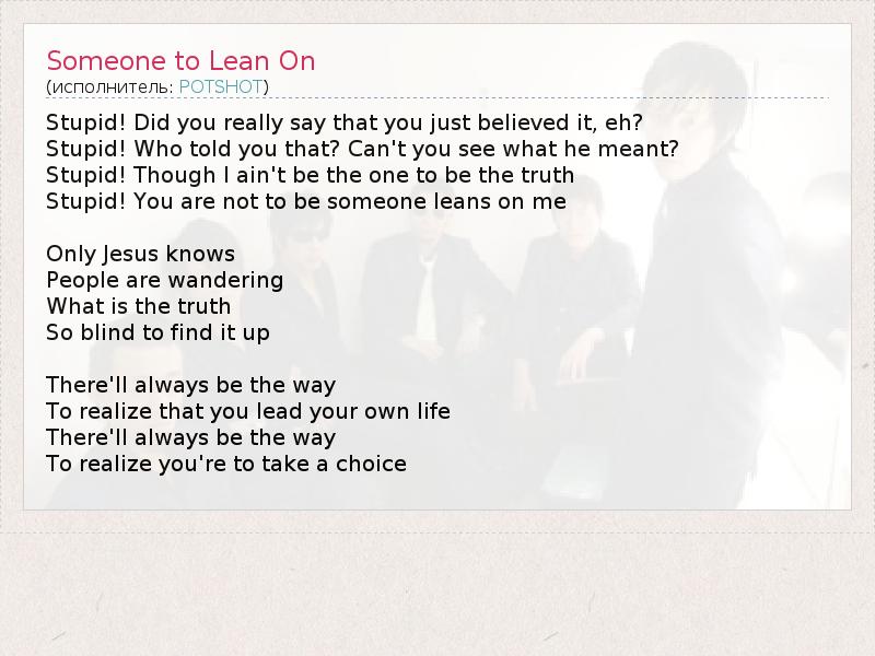 А как ты думаешь, о чем песня "Someone to Lean On" ?