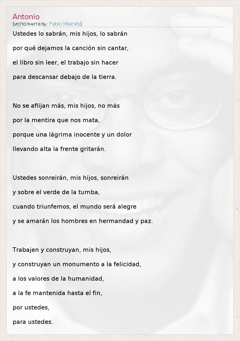 Это интересно:Па́бло Милане́с Ариас (исп. Pablo Milanés Arias; 24 февраля 1943, Баямо, Куба) — кубинский композитор, поэт, гитарист и певец, один из основателей (наряду с Сильвио Родригесом и Ноэлем Николой) кубинского музыкального движения «нуэва трова». Закончил Гаванскую консерваторию.Начинал как исполнитель песен в стиле feeling. В дальнейшем работал в разных музыкальных стилях, как традиционных для кубинской... продолжение