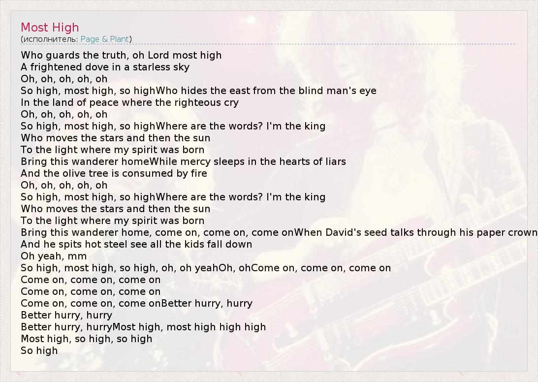 Who guards the truth, oh Lord most high A frightened dove in a starless sky Oh, oh, oh, oh, oh So high, most high, so highWho hides the east from the blind man's eye In the land of peace where the righteous cry Oh, oh, oh, oh, oh So high, most high, so highWhere are the words? I'm the king Who moves the stars and then the sun To the light where my spirit was born Bring this wanderer homeWhile mercy sleeps in the hearts of liars And the olive tree is consumed by fire Oh, oh, oh, oh, oh So high, most high, so highWhere are the words? I'm the king Who moves the stars and then the sun To the light where my spirit was born Bring this wanderer home, come on, come on, come onWhen David's seed talks through his paper crown And he spits hot steel see all the kids fall down Oh yeah, mm So high, most high, so high, oh, oh yeahOh, ohCome on, come on, come on Come on, come on, come on Come on, come on, come on Come on, come on, come onBetter hurry, hurry Better hurry, hurry Better hurry, hurryMost high, most high high high Most high, so high, so high So high