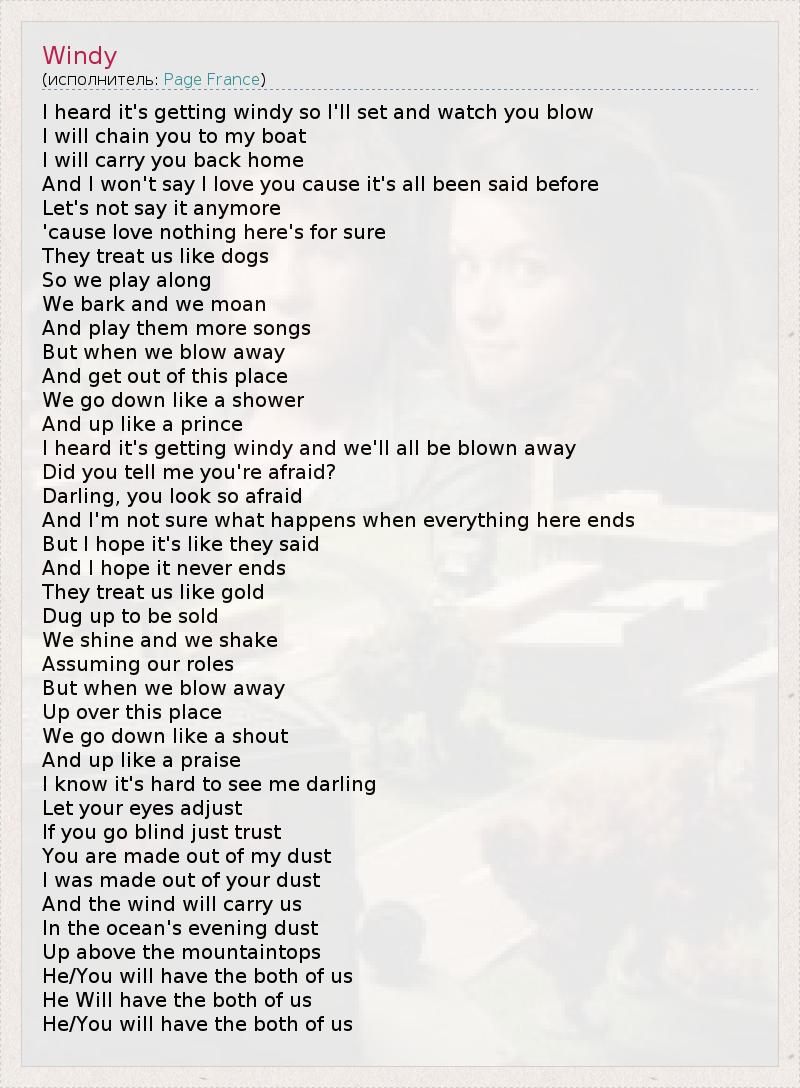 I heard it's getting windy so I'll set and watch you blow I will chain you to my boat I will carry you back home And I won't say I love you cause it's all been said before Let's not say it anymore 'cause love nothing here's for sure They treat us like dogs So we play along We bark and we moan And play them more songs But when we blow away And get out of this place We go down like a shower And up like a prince I heard it's getting windy and we'll all be blown away Did you tell me you're afraid? Darling, you look so afraid And I'm not sure what happens when everything here ends But I hope it's like they said And I hope it never ends They treat us like gold Dug up to be sold We shine and we shake Assuming our roles But when we blow away Up over this place We go down like a shout And up like a praise I know it's hard to see me darling Let your eyes adjust If you go blind just trust You are made out of my dust I was made out of your dust And the wind will carry us In the ocean's evening dust Up above the mountaintops He/You will have the both of us He Will have the both of us He/You will have the both of us