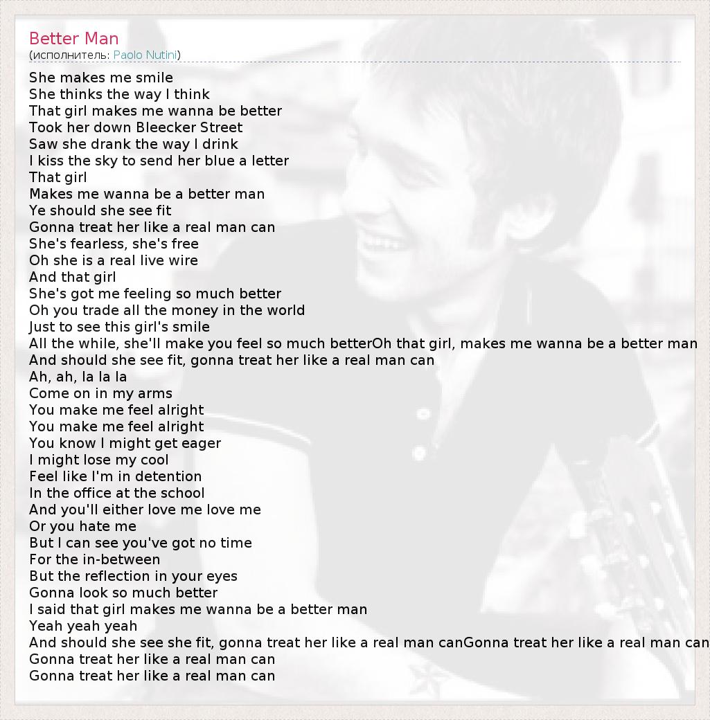 She makes me smile She thinks the way I think That girl makes me wanna be better Took her down Bleecker Street Saw she drank the way I drink I kiss the sky to send her blue a letter That girl Makes me wanna be a better man Ye should she see fit Gonna treat her like a real man can She's fearless, she's free Oh she is a real live wire And that girl She's got me feeling so much better Oh you trade all the money in the world Just to see this girl's smile All the while, she'll make you feel so much betterOh that girl, makes me wanna be a better man And should she see fit, gonna treat her like a real man can Ah, ah, la la la Come on in my arms You make me feel alright You make me feel alright You know I might get eager I might lose my cool Feel like I'm in detention In the office at the school And you'll either love me love me Or you hate me But I can see you've got no time For the in-between But the reflection in your eyes Gonna look so much better I said that girl makes me wanna be a better man Yeah yeah yeah And should she see she fit, gonna treat her like a real man canGonna treat her like a real man can Gonna treat her like a real man can Gonna treat her like a real man can