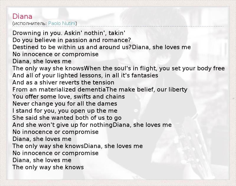 Drowning in you. Askin' nothin', takin' Do you believe in passion and romance? Destined to be within us and around us?Diana, she loves me No innocence or compromise Diana, she loves me The only way she knowsWhen the soul's in flight, you set your body free And all of your lighted lessons, in all it's fantasies And as a shiver reverts the tension From an materialized dementiaThe make belief, our liberty You offer some love, swifts and chains Never change you for all the dames I stand for you, you open up the me She said she wanted both of us to go And she won't give up for nothingDiana, she loves me No innocence or compromise Diana, she loves me The only way she knowsDiana, she loves me No innocence or compromise Diana, she loves me The only way she knows