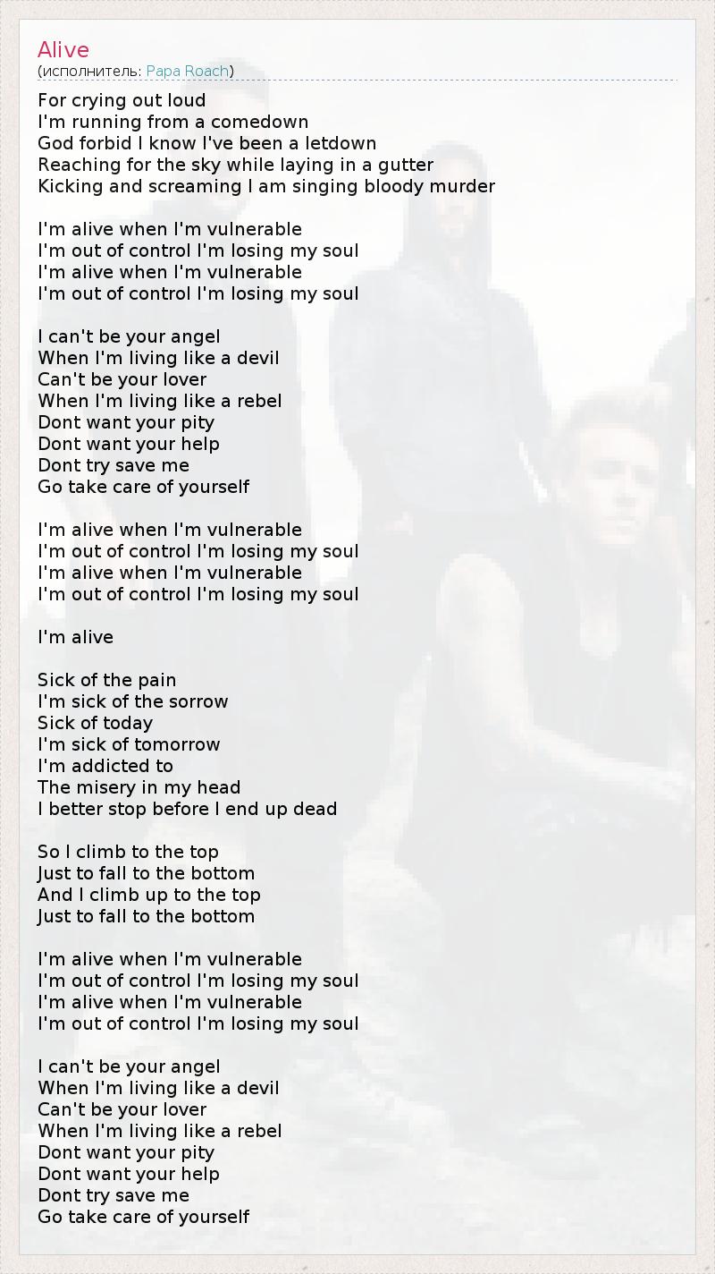 Это интересно:Papa Roach —рок-группа, состоящая из четырех участников. Образована в городе Вакавилль, Калифорния, США. Они приобрели популярность благодаря своему творению — трижды платиновому альбому Infest (2000). Успех группы закрепили последующие работы — Lovehatetragedy (2002) и Getting Away With Murder (2004). Их четвертый альбом, The Paramour Sessions,... продолжение