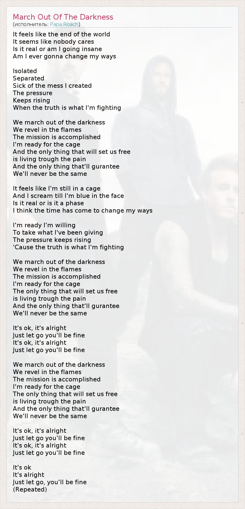 It feels like the end of the world It seems like nobody cares Is it real or am I going insane Am I ever gonna change my ways Isolated Separated Sick of the mess I created The pressure Keeps rising When the truth is what I'm fighting We march out of the darkness We revel in the flames The mission is accomplished I'm ready for the cage And the only thing that will set us free is living trough the pain And the only thing that'll gurantee We'll never be the same It feels like I'm still in a cage And I scream till I'm blue in the face Is it real or is it a phase I think the time has come to change my ways I'm ready I'm willing To take what I've been giving The pressure keeps rising 'Cause the truth is what I'm fighting We march out of the darkness We revel in the flames The mission is accomplished I'm ready for the cage The only thing that will set us free is living trough the pain And the only thing that'll gurantee We'll never be the same It's ok, it's alright Just let go you'll be fine It's ok, it's alright Just let go you'll be fine We march out of the darkness We revel in the flames The mission is accomplished I'm ready for the cage The only thing that will set us free is living trough the pain And the only thing that'll gurantee We'll never be the same It's ok, it's alright Just let go you'll be fine It's ok, it's alright Just let go you'll be fine It's ok It's alright Just let go, you'll be fine (Repeated)