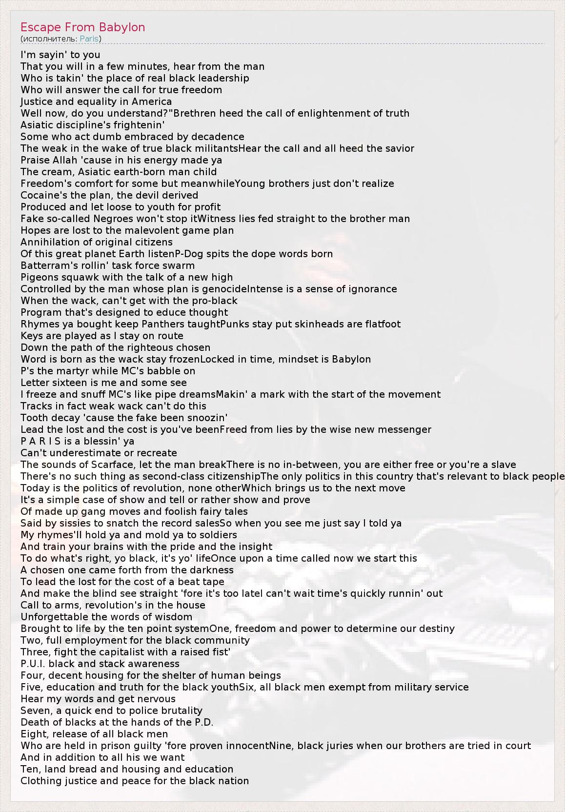 А как ты думаешь, о чем песня "Escape From Babylon" ?