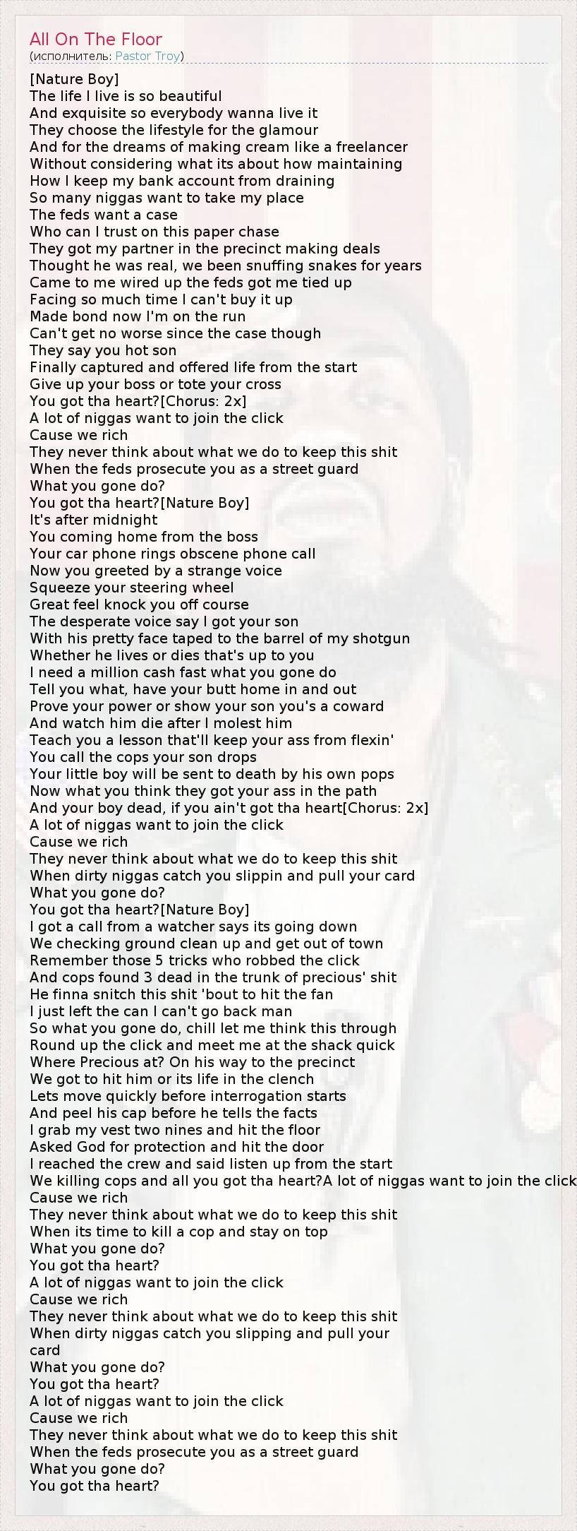 Это интересно:Pastor Troy в своей студии…глаза закрыты…вредная улыбка…танцуя как человек, преодоленный святым духом..он не обращает внимания на окружающих…Всеми его делами в тот момент являются музыка и слова от которых подпрыгивает пол…В конце песни с распустившейся усмешкой "Ну че думаете?Я на правильном пути?" спрашивает он риторически.Он просит поставить следующий трек…поскольку... продолжение