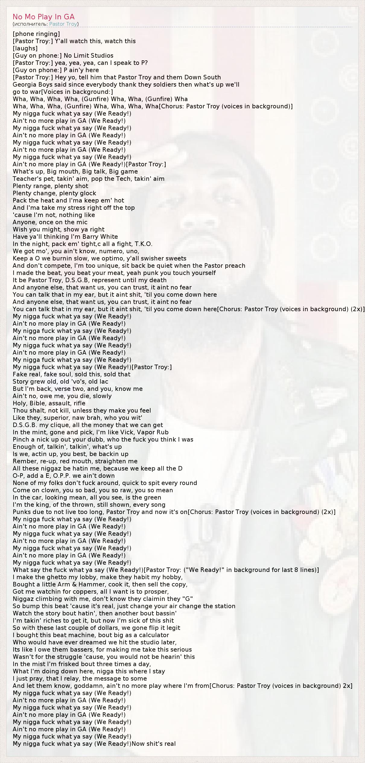And let them know, goddamn, ain't no more play where I'm from[Chorus: Pastor Troy (voices in background) 2x]