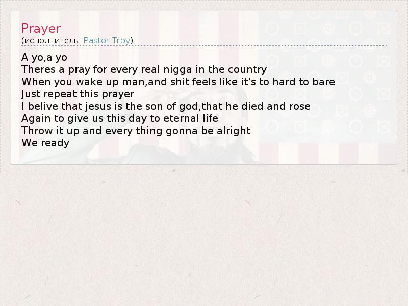Это интересно:Pastor Troy в своей студии…глаза закрыты…вредная улыбка…танцуя как человек, преодоленный святым духом..он не обращает внимания на окружающих…Всеми его делами в тот момент являются музыка и слова от которых подпрыгивает пол…В конце песни с распустившейся усмешкой "Ну че думаете?Я на правильном пути?" спрашивает он риторически.Он просит поставить следующий трек…поскольку... продолжение