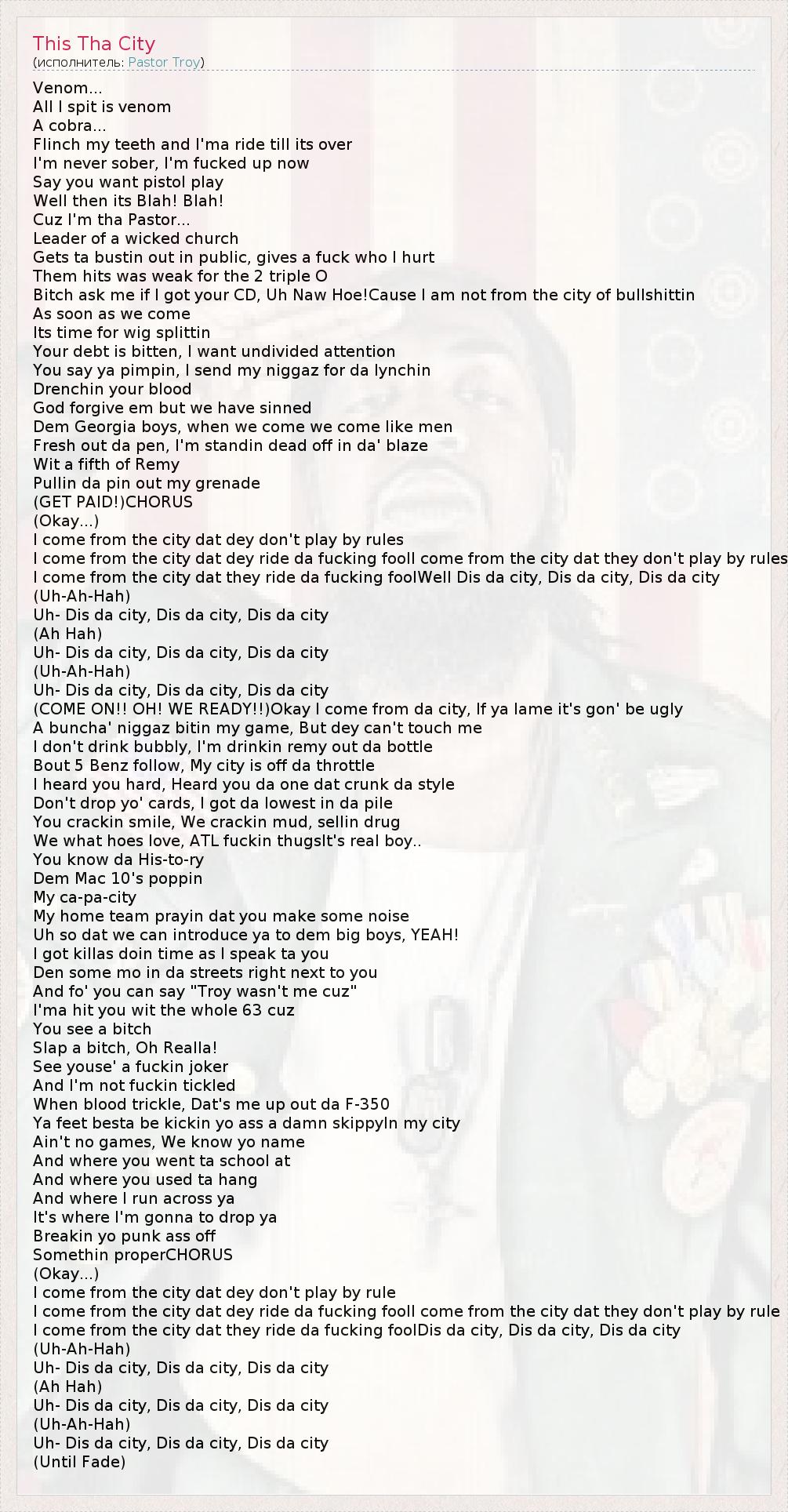 I come from the city dat dey ride da fucking foolI come from the city dat they don't play by rule
