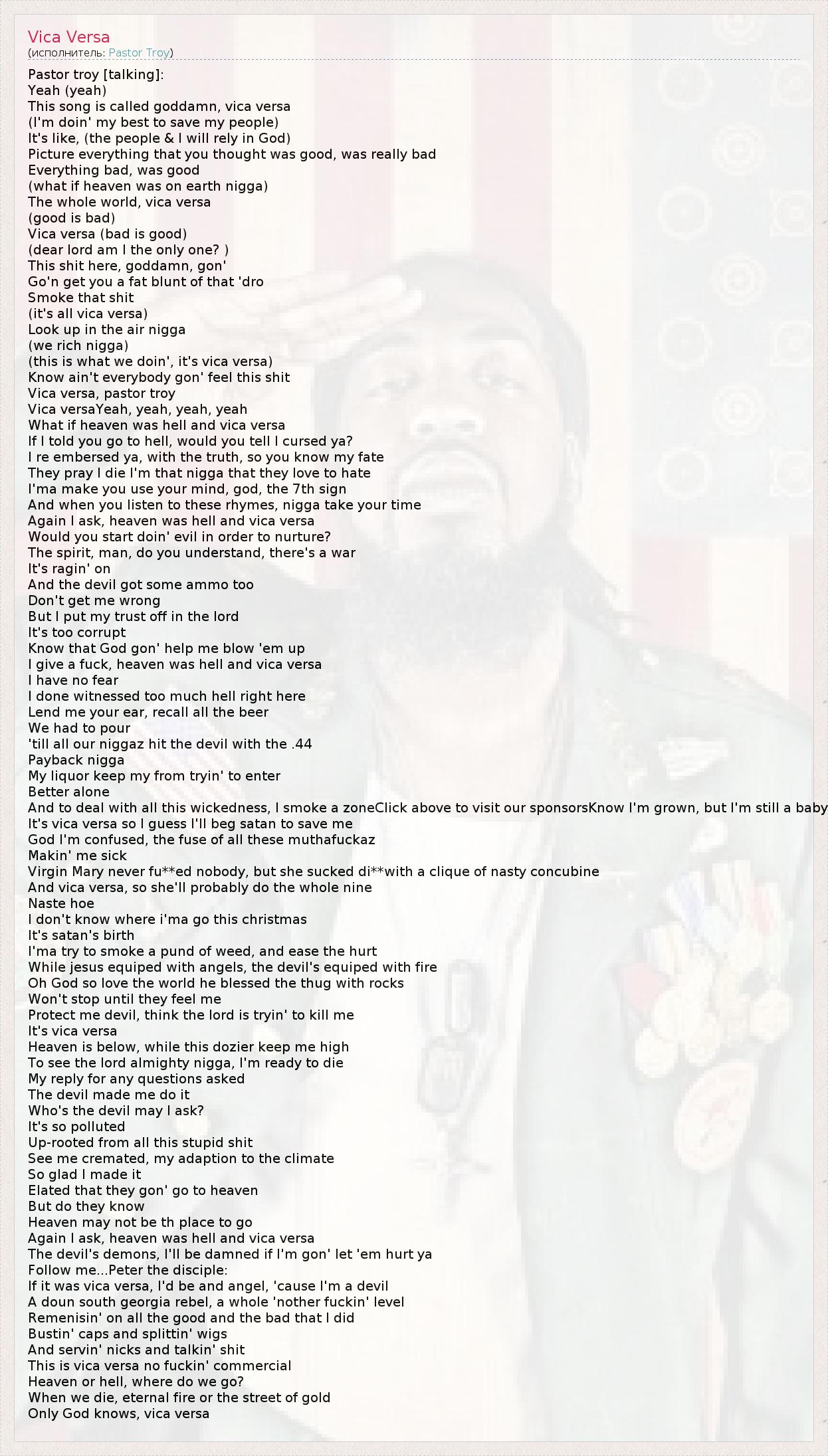 Pastor troy [talking]: Yeah (yeah) This song is called goddamn, vica versa (I'm doin' my best to save my people) It's like, (the people & I will rely in God) Picture everything that you thought was good, was really bad Everything bad, was good (what if heaven was on earth nigga) The whole world, vica versa (good is bad) Vica versa (bad is good) (dear lord am I the only one? ) This shit here, goddamn, gon' Go'n get you a fat blunt of that 'dro Smoke that shit (it's all vica versa) Look up in the air nigga (we rich nigga) (this is what we doin', it's vica versa) Know ain't everybody gon' feel this shit Vica versa, pastor troy Vica versaYeah, yeah, yeah, yeah What if heaven was hell and vica versa If I told you go to hell, would you tell I cursed ya? I re embersed ya, with the truth, so you know my fate They pray I die I'm that nigga that they love to hate I'ma make you use your mind, god, the 7th sign And when you listen to these rhymes, nigga take your time Again I ask, heaven was hell and vica versa Would you start doin' evil in order to nurture? The spirit, man, do you understand, there's a war It's ragin' on And the devil got some ammo too Don't get me wrong But I put my trust off in the lord It's too corrupt Know that God gon' help me blow 'em up I give a fuck, heaven was hell and vica versa I have no fear I done witnessed too much hell right here Lend me your ear, recall all the beer We had to pour 'till all our niggaz hit the devil with the .44 Payback nigga My liquor keep my from tryin' to enter Better alone And to deal with all this wickedness, I smoke a zoneClick above to visit our sponsorsKnow I'm grown, but I'm still a baby It's vica versa so I guess I'll beg satan to save me God I'm confused, the fuse of all these muthafuckaz Makin' me sick Virgin Mary never fu**ed nobody, but she sucked di**with a clique of nasty concubine And vica versa, so she'll probably do the whole nine Naste hoe I don't know where i'ma go this christmas It's satan's birth I'ma try to smoke a pund of weed, and ease the hurt While jesus equiped with angels, the devil's equiped with fire Oh God so love the world he blessed the thug with rocks Won't stop until they feel me Protect me devil, think the lord is tryin' to kill me It's vica versa Heaven is below, while this dozier keep me high To see the lord almighty nigga, I'm ready to die My reply for any questions asked The devil made me do it Who's the devil may I ask? It's so polluted Up-rooted from all this stupid shit See me cremated, my adaption to the climate So glad I made it Elated that they gon' go to heaven But do they know Heaven may not be th place to go Again I ask, heaven was hell and vica versa The devil's demons, I'll be damned if I'm gon' let 'em hurt ya Follow me...Peter the disciple: If it was vica versa, I'd be and angel, 'cause I'm a devil A doun south georgia rebel, a whole 'nother fuckin' level Remenisin' on all the good and the bad that I did Bustin' caps and splittin' wigs And servin' nicks and talkin' shit This is vica versa no fuckin' commercial Heaven or hell, where do we go? When we die, eternal fire or the street of gold Only God knows, vica versa