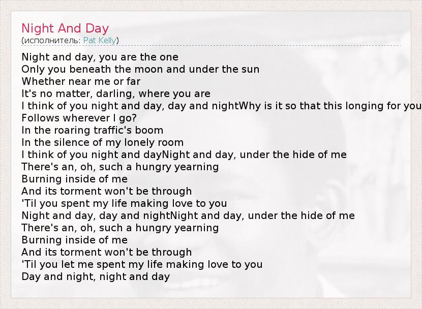 Night and day, you are the one Only you beneath the moon and under the sun Whether near me or far It's no matter, darling, where you are I think of you night and day, day and nightWhy is it so that this longing for you Follows wherever I go? In the roaring traffic's boom In the silence of my lonely room I think of you night and dayNight and day, under the hide of me There's an, oh, such a hungry yearning Burning inside of me And its torment won't be through 'Til you spent my life making love to you Night and day, day and nightNight and day, under the hide of me There's an, oh, such a hungry yearning Burning inside of me And its torment won't be through 'Til you let me spent my life making love to you Day and night, night and day