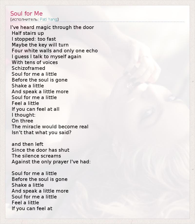 I've heard magic through the door Half stairs up I stopped: too fast Maybe the key will turn Four white walls and only one echo I guess I talk to myself again With tens of voices Schizoframed Soul for me a little Before the soul is gone Shake a little And speak a little more Soul for me a little Feel a little If you can feel at all I thought: On three The miracle would become real Isn't that what you said? and then left Since the door has shut The silence screams Against the only prayer I've had: Soul for me a little Before the soul is gone Shake a little And speak a little more Soul for me a little Feel a little If you can feel at