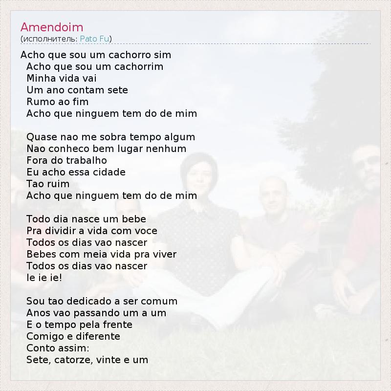 Acho que sou um cachorro sim Acho que sou um cachorrim Minha vida vai Um ano contam sete Rumo ao fim Acho que ninguem tem do de mim Quase nao me sobra tempo algum Nao conheco bem lugar nenhum Fora do trabalho Eu acho essa cidade Tao ruim Acho que ninguem tem do de mim Todo dia nasce um bebe Pra dividir a vida com voce Todos os dias vao nascer Bebes com meia vida pra viver Todos os dias vao nascer Ie ie ie! Sou tao dedicado a ser comum Anos vao passando um a um E o tempo pela frente Comigo e diferente Conto assim: Sete, catorze, vinte e um