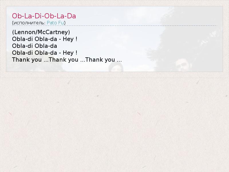 (Lennon/McCartney) Obla-di Obla-da - Hey ! Obla-di Obla-da Obla-di Obla-da - Hey ! Thank you ...Thank you ...Thank you ...