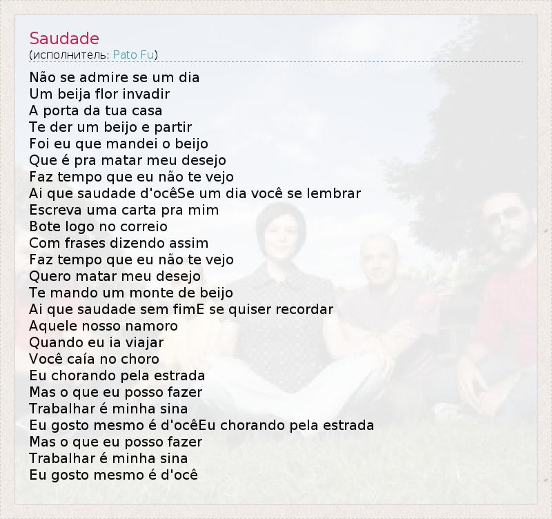 Это интересно:Пату Фу бразильская группа из Белу-Оризонти, Минас Жерайс, образовалась в 1992 году. В состав входят: Фернанда Такай (вокал и гитара), Джон Улоа (гитара, вокал, клавишные, программирование), Рикарду Коктус (бас-гитара, вокал), Шанду Тамьетти (ударные), Лулу Камарго (клавишные)Их первый альбом Rotomusic de Liquidificapum был выпущен в 1993 году. С тех пор они выпустили еще восемь Gol de Quem?, Tem Mas Acabou, Televisão de Cachorro,... продолжение