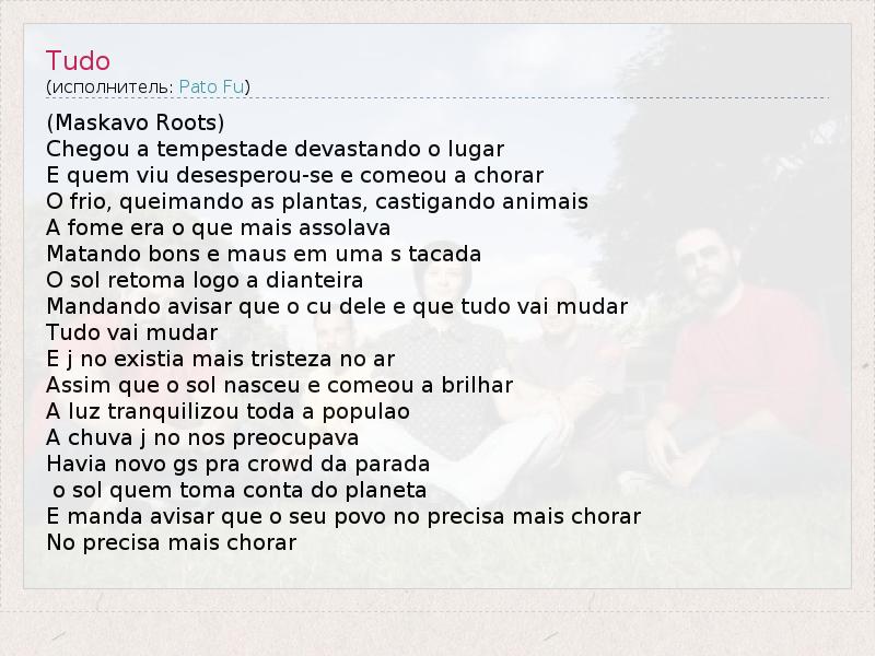 (Maskavo Roots) Chegou a tempestade devastando o lugar E quem viu desesperou-se e comeou a chorar O frio, queimando as plantas, castigando animais A fome era o que mais assolava Matando bons e maus em uma s tacada O sol retoma logo a dianteira Mandando avisar que o cu dele e que tudo vai mudar Tudo vai mudar E j no existia mais tristeza no ar Assim que o sol nasceu e comeou a brilhar A luz tranquilizou toda a populao A chuva j no nos preocupava Havia novo gs pra crowd da parada o sol quem toma conta do planeta E manda avisar que o seu povo no precisa mais chorar No precisa mais chorar