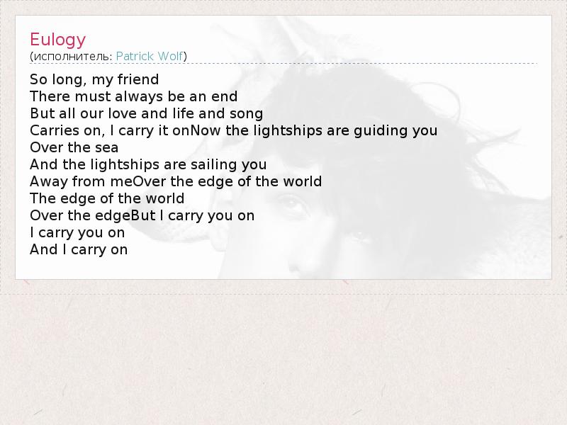 Это интересно:Патрик Вулф (англ. Patrick Wolf, 30 июня 1983, Лондон, Великобритания) — современный британский певец, музыкант и композитор. Настоящее имя Patrick Denis Apps. Играет на большом количестве музыкальных инструментов, в том числе таких как укулеле, фортепиано и альт. Пишет музыку, используя как сэмплы, так и классические музыкальные инструменты. Его стиль варьируется от романтичного фолка до техно-попа.Пи... продолжение