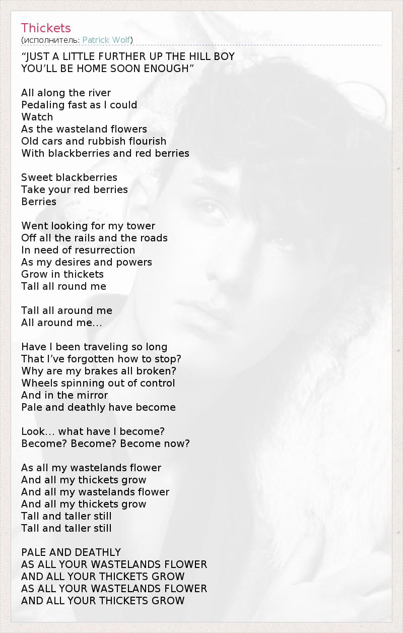 “JUST A LITTLE FURTHER UP THE HILL BOY YOU’LL BE HOME SOON ENOUGH” All along the river Pedaling fast as I could Watch As the wasteland flowers Old cars and rubbish flourish With blackberries and red berries Sweet blackberries Take your red berries Berries Went looking for my tower Off all the rails and the roads In need of resurrection As my desires and powers Grow in thickets Tall all round me Tall all around me All around me… Have I been traveling so long That I’ve forgotten how to stop? Why are my brakes all broken? Wheels spinning out of control And in the mirror Pale and deathly have become Look… what have I become? Become? Become? Become now? As all my wastelands flower And all my thickets grow And all my wastelands flower And all my thickets grow Tall and taller still Tall and taller still PALE AND DEATHLY AS ALL YOUR WASTELANDS FLOWER AND ALL YOUR THICKETS GROW AS ALL YOUR WASTELANDS FLOWER AND ALL YOUR THICKETS GROW