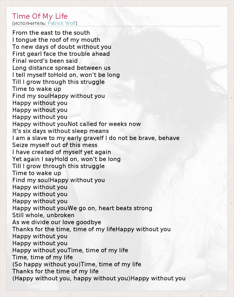 From the east to the south I tongue the roof of my mouth To new days of doubt without you First gearI face the trouble ahead Final word's been said Long distance spread between us I tell myself toHold on, won't be long Till I grow through this struggle Time to wake up Find my soulHappy without you Happy without you Happy without you Happy without you Happy without youNot called for weeks now It's six days without sleep means I am a slave to my early graveIf I do not be brave, behave Seize myself out of this mess I have created of myself yet again Yet again I sayHold on, won't be long Till I grow through this struggle Time to wake up Find my soulHappy without you Happy without you Happy without you Happy without you Happy without youWe go on, heart beats strong Still whole, unbroken As we divide our love goodbye Thanks for the time, time of my lifeHappy without you Happy without you Happy without you Happy without youTime, time of my life Time, time of my life (So happy without you)Time, time of my life Thanks for the time of my life (Happy without you, happy without you)Happy without you