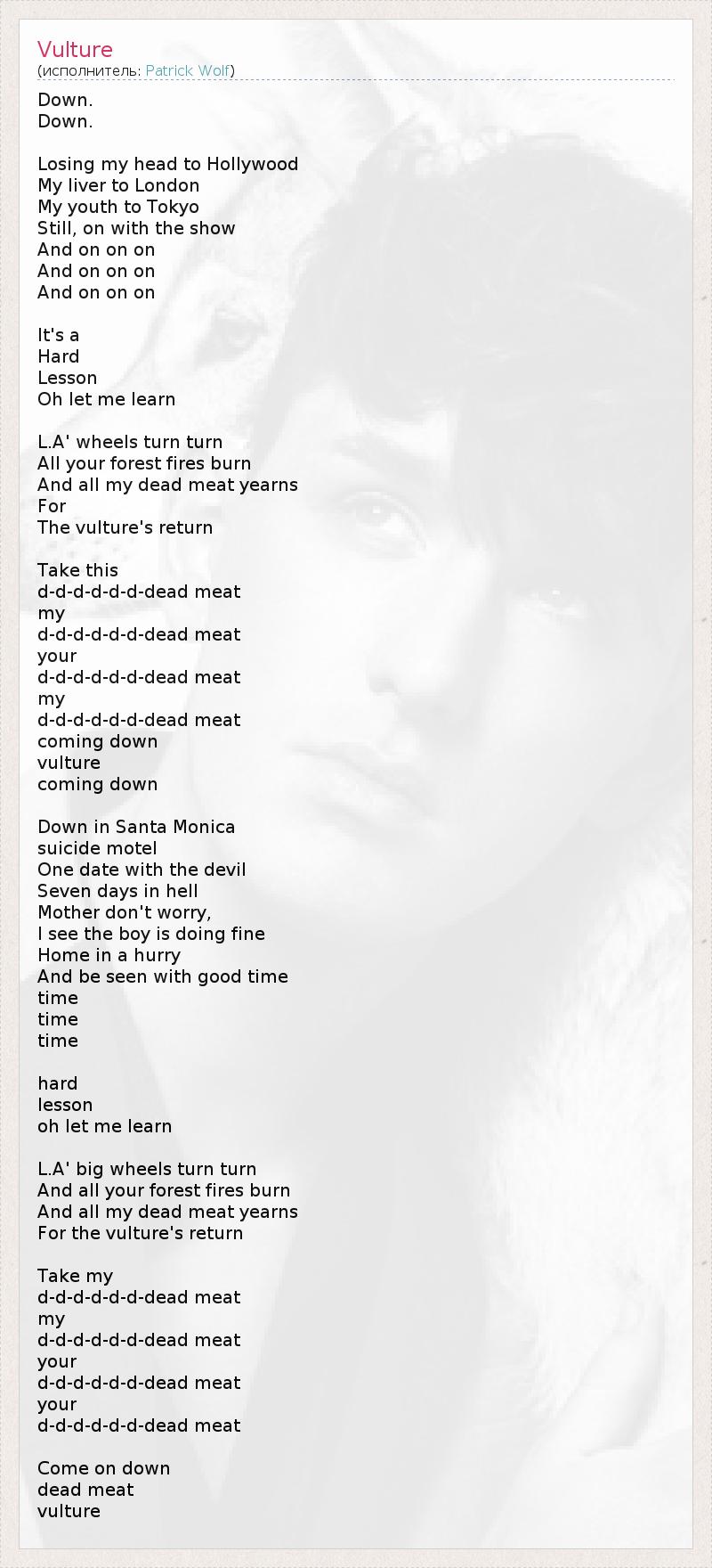 Это интересно:Патрик Вулф (англ. Patrick Wolf, 30 июня 1983, Лондон, Великобритания) — современный британский певец, музыкант и композитор. Настоящее имя Patrick Denis Apps. Играет на большом количестве музыкальных инструментов, в том числе таких как укулеле, фортепиано и альт. Пишет музыку, используя как сэмплы, так и классические музыкальные инструменты. Его стиль варьируется от романтичного фолка до техно-попа.Пи... продолжение
