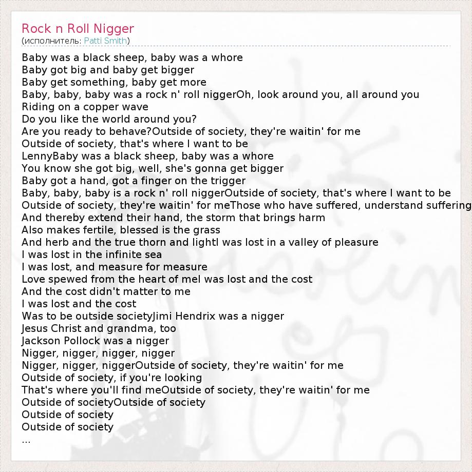 Baby was a black sheep, baby was a whore Baby got big and baby get bigger Baby get something, baby get more Baby, baby, baby was a rock n' roll niggerOh, look around you, all around you Riding on a copper wave Do you like the world around you? Are you ready to behave?Outside of society, they're waitin' for me Outside of society, that's where I want to be LennyBaby was a black sheep, baby was a whore You know she got big, well, she's gonna get bigger Baby got a hand, got a finger on the trigger Baby, baby, baby is a rock n' roll niggerOutside of society, that's where I want to be Outside of society, they're waitin' for meThose who have suffered, understand suffering And thereby extend their hand, the storm that brings harm Also makes fertile, blessed is the grass And herb and the true thorn and lightI was lost in a valley of pleasure I was lost in the infinite sea I was lost, and measure for measure Love spewed from the heart of meI was lost and the cost And the cost didn't matter to me I was lost and the cost Was to be outside societyJimi Hendrix was a nigger Jesus Christ and grandma, too Jackson Pollock was a nigger Nigger, nigger, nigger, nigger Nigger, nigger, niggerOutside of society, they're waitin' for me Outside of society, if you're looking That's where you'll find meOutside of society, they're waitin' for me Outside of societyOutside of society Outside of society Outside of society ...