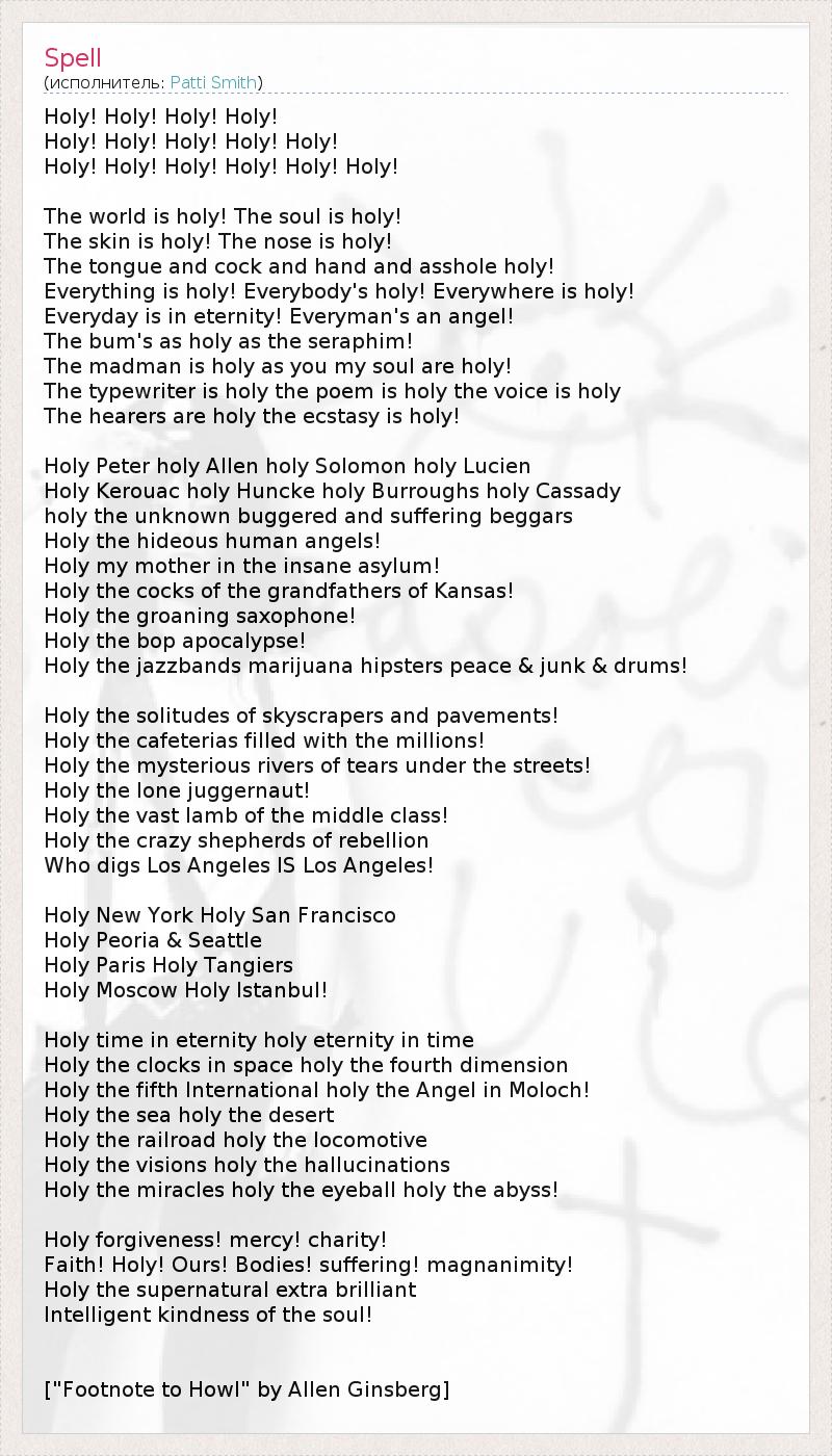 Святость! Святость! Святость! Святость! Святость! Святость! Святость! Святость! Святость! Святость! Святость! Свят! Свят! Свят! Свят мир! Свят дух! Свята кожа! Свят нос! Свят язык, и член, и ладонь, и зад**ца! Святость во всем! Святость во всех! Святость везде! Каждый день запечатлен в вечности! Каждый человек - ангел! Бездомный свят, словно серафим! Безумный свят, как твоя - и моя - душа! Свята машинка; свята поэма; свят голос; Святы слышащие его; экстаз священен! Святой Петер, святой Аллен, святой Соломон, святой Люсьен, Святой Керуак, святой Ханке, святой Берроуз, святой Кэссиди! Святы терзаемые, насилуемые, страдающие нищие! Святы страшные ангелы человечества! Свята моя мать, запертая в психиатрической больнице! Святы члены наших канзасских стариков! Свят рыдающий саксофон! Свят джазовый апокалипсис! Святы джаз-бэнды - марихуана - хипстеры - мир - джанк - барабаны!.. Свята бесприютность небоскребов и мостовых! Святы ресторанчики, где обедают миллионы! Святы мистические реки слез под дорогами нашими! Свят неумолимый одиночка! Свят жирный агнец среднего класса! Святы безумные пастухи революции! Дети Лос-Анджелеса, вы и есть Лос-Анджелес! Свят Нью-Йорк! Свят Сан-Франциско! Святы Пеория и Сиэтл! Свят Париж! Свят Танжер! Свята Москва! Свята Москва! Свят Стамбул! Святы время в вечности и вечность во времени! Святы часы в пространстве! Свято 4-е измерение! Свят V Интернационал, свят Ангел Молоха! Свято море - свята пустыня - Святы железнодорожные пути - свят электровоз! Святы видения - святы галлюцинации - Святы чудеса - святы глаза наши - свята бездна! Святы прощение! сострадание! милосердие! Вера! Святы! Наши! Тела! В благородном! Страдании! Свята сверхъестественная необыкновенная блистательная Всезнающая доброта души!.. [Текст - "Подстрочник к "Воплю"" А. Гинзберга]