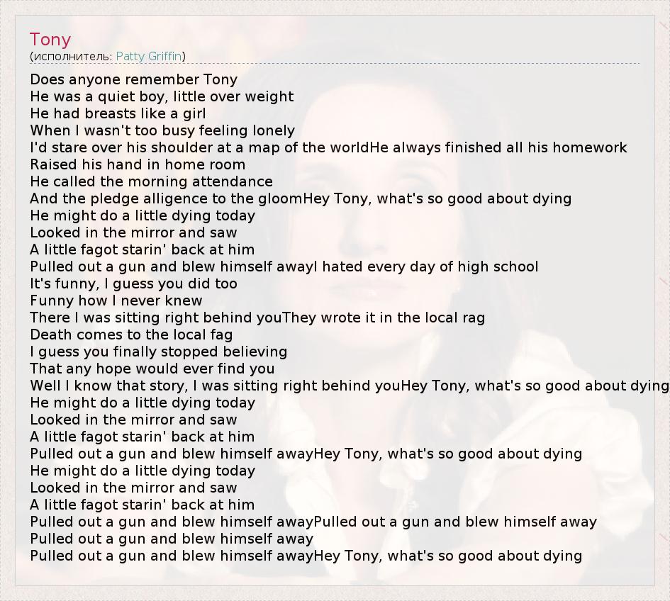 Well I know that story, I was sitting right behind youHey Tony, what's so good about dying