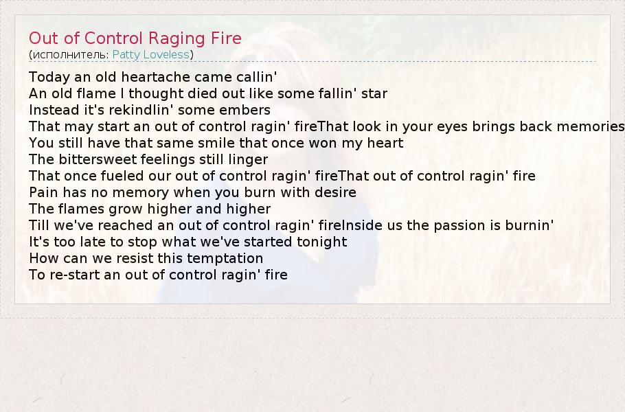 ГлавнаяИсполнителиPatty LovelessOut of Control Raging Fire