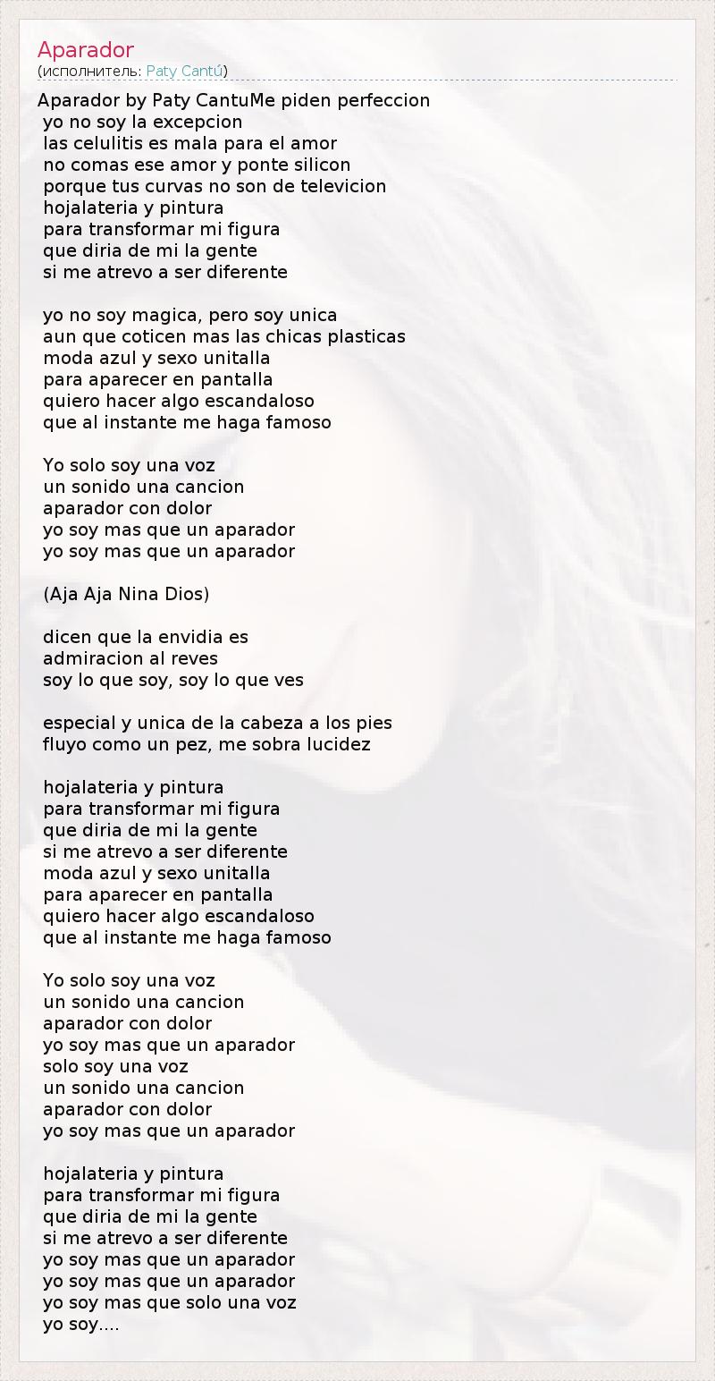 Это интересно:Пати Канту (Paty Cantú) - это мексиканская певица и композитор. Экс-солистка дуэта Lu.Родилась 25 ноября 1983 года в Гвадалахаре (Мексика).В 2007 году покинула дуэт Lu и занялась сольной карьерой.27 июля 2008, через свою Официальную Страницу на MySpace Пати предоставила возможность услышать её первую сольную работу - «Déjame Ir». Песня, распространившись в Интернете, пользовалась известностью.6... продолжение