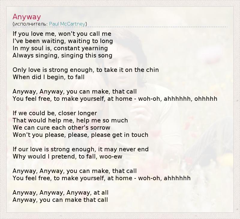 If you love me, won't you call me I've been waiting, waiting to long In my soul is, constant yearning Always singing, singing this song Only love is strong enough, to take it on the chin When did I begin, to fall Anyway, Anyway, you can make, that call You feel free, to make yourself, at home - woh-oh, ahhhhhh, ohhhhh If we could be, closer longer That would help me, help me so much We can cure each other's sorrow Won't you please, please, please get in touch If our love is strong enough, it may never end Why would I pretend, to fall, woo-ew Anyway, Anyway, you can make, that call You feel free, to make yourself, at home - woh-oh, ahhhhhh Anyway, Anyway, Anyway, at all Anyway, you can make that call