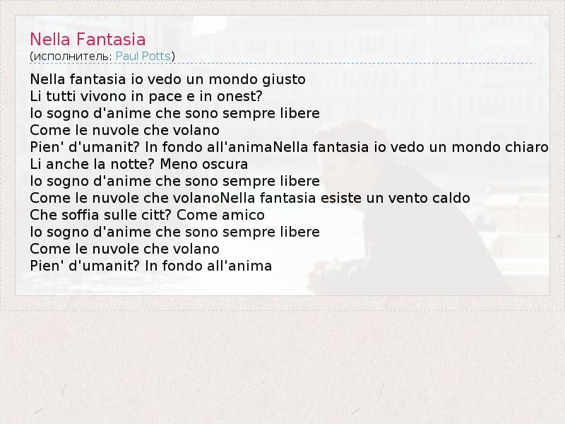 А как ты думаешь, о чем песня "Nella Fantasia" ?