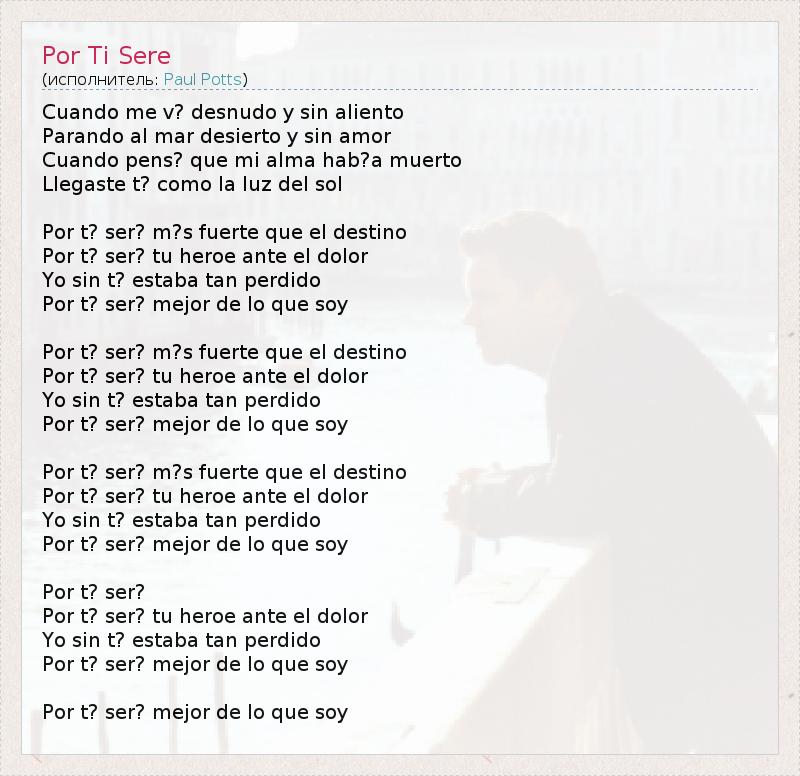Cuando me v? desnudo y sin aliento Parando al mar desierto y sin amor Cuando pens? que mi alma hab?a muerto Llegaste t? como la luz del sol Por t? ser? m?s fuerte que el destino Por t? ser? tu heroe ante el dolor Yo sin t? estaba tan perdido Por t? ser? mejor de lo que soy Por t? ser? m?s fuerte que el destino Por t? ser? tu heroe ante el dolor Yo sin t? estaba tan perdido Por t? ser? mejor de lo que soy Por t? ser? m?s fuerte que el destino Por t? ser? tu heroe ante el dolor Yo sin t? estaba tan perdido Por t? ser? mejor de lo que soy Por t? ser? Por t? ser? tu heroe ante el dolor Yo sin t? estaba tan perdido Por t? ser? mejor de lo que soy Por t? ser? mejor de lo que soy