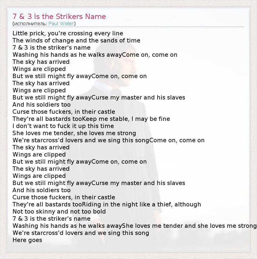 А как ты думаешь, о чем песня "7 & 3 Is the Strikers Name" ?