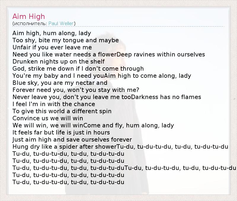 Aim high, hum along, lady Too shy, bite my tongue and maybe Unfair if you ever leave me Need you like water needs a flowerDeep ravines within ourselves Drunken nights up on the shelf God, strike me down if I don't come through You're my baby and I need youAim high to come along, lady Blue sky, you are my nectar and Forever need you, won't you stay with me? Never leave you, don't you leave me tooDarkness has no flames I feel I'm in with the chance To give this world a different spin Convince us we will win We will win, we will winCome and fly, hum along, lady It feels far but life is just in hours Just aim high and save ourselves forever Hung dry like a spider after showerTu-du, tu-du-tu-du, tu-du, tu-du-tu-du Tu-du, tu-du-tu-du, tu-du, tu-du-tu-du Tu-du, tu-du-tu-du, tu-du, tu-du-tu-du Tu-du, tu-du-tu-du, tu-du, tu-du-tu-duTu-du, tu-du-tu-du, tu-du, tu-du-tu-du Tu-du, tu-du-tu-du, tu-du, tu-du-tu-du Tu-du, tu-du-tu-du, tu-du, tu-du-tu-du