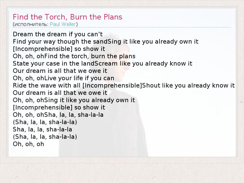 Dream the dream if you can't Find your way though the sandSing it like you already own it [Incomprehensible] so show it Oh, oh, ohFind the torch, burn the plans State your case in the landScream like you already know it Our dream is all that we owe it Oh, oh, ohLive your life if you can Ride the wave with all [Incomprehensible]Shout like you already know it Our dream is all that we owe it Oh, oh, ohSing it like you already own it [Incomprehensible] so show it Oh, oh, ohSha, la, la, sha-la-la (Sha, la, la, sha-la-la) Sha, la, la, sha-la-la (Sha, la, la, sha-la-la) Oh, oh, oh