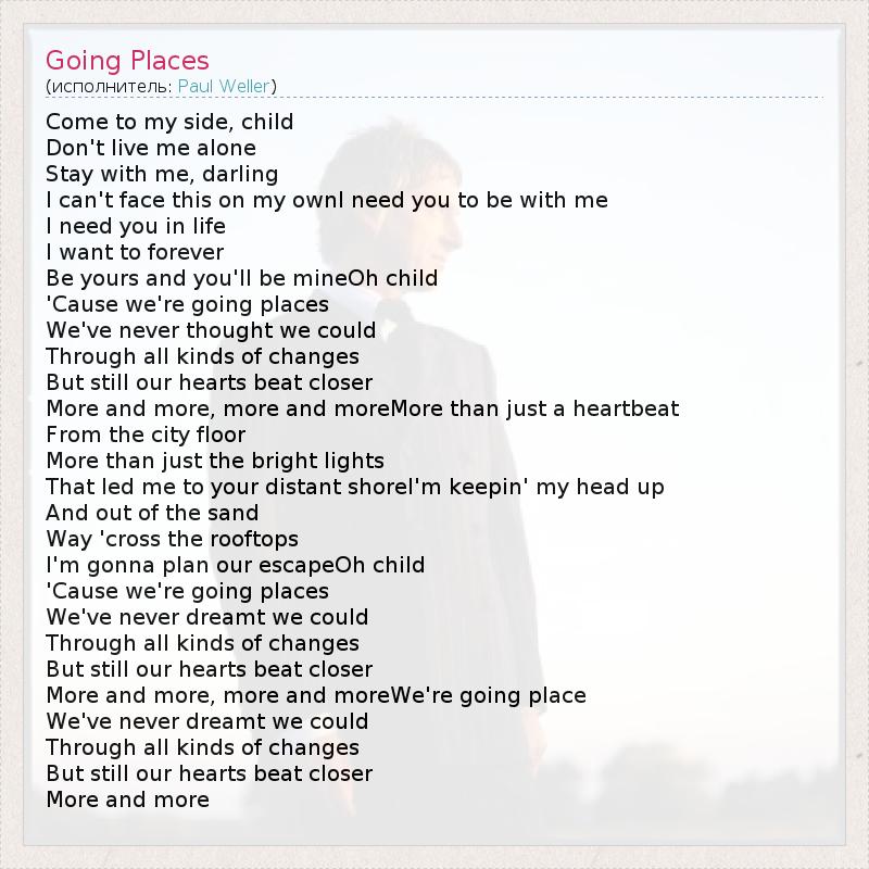 Come to my side, child Don't live me alone Stay with me, darling I can't face this on my ownI need you to be with me I need you in life I want to forever Be yours and you'll be mineOh child 'Cause we're going places We've never thought we could Through all kinds of changes But still our hearts beat closer More and more, more and moreMore than just a heartbeat From the city floor More than just the bright lights That led me to your distant shoreI'm keepin' my head up And out of the sand Way 'cross the rooftops I'm gonna plan our escapeOh child 'Cause we're going places We've never dreamt we could Through all kinds of changes But still our hearts beat closer More and more, more and moreWe're going place We've never dreamt we could Through all kinds of changes But still our hearts beat closer More and more