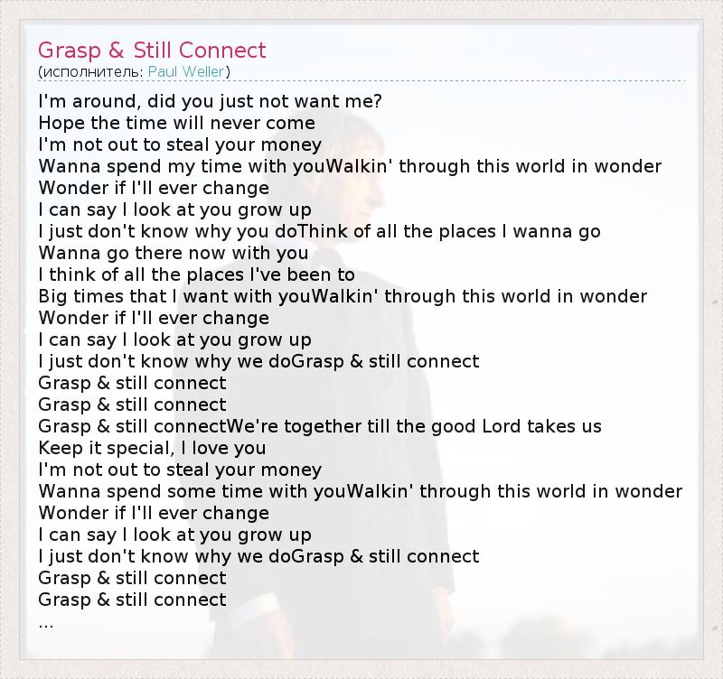 I'm around, did you just not want me? Hope the time will never come I'm not out to steal your money Wanna spend my time with youWalkin' through this world in wonder Wonder if I'll ever change I can say I look at you grow up I just don't know why you doThink of all the places I wanna go Wanna go there now with you I think of all the places I've been to Big times that I want with youWalkin' through this world in wonder Wonder if I'll ever change I can say I look at you grow up I just don't know why we doGrasp & still connect Grasp & still connect Grasp & still connect Grasp & still connectWe're together till the good Lord takes us Keep it special, I love you I'm not out to steal your money Wanna spend some time with youWalkin' through this world in wonder Wonder if I'll ever change I can say I look at you grow up I just don't know why we doGrasp & still connect Grasp & still connect Grasp & still connect ...