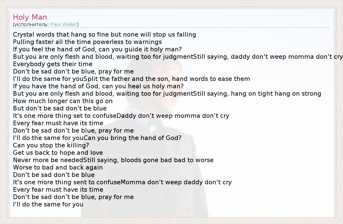 Crystal words that hang so fine but none will stop us falling Pulling faster all the time powerless to warnings If you feel the hand of God, can you guide it holy man? But you are only flesh and blood, waiting too for judgmentStill saying, daddy don't weep momma don't cry Everybody gets their time Don't be sad don't be blue, pray for me I'll do the same for youSplit the father and the son, hand words to ease them If you have the hand of God, can you heal us holy man? But you are only flesh and blood, waiting too for judgmentStill saying, hang on tight hang on strong How much longer can this go on But don't be sad don't be blue It's one more thing set to confuseDaddy don't weep momma don't cry Every fear must have its time Don't be sad don't be blue, pray for me I'll do the same for youCan you bring the hand of God? Can you stop the killing? Get us back to hope and love Never more be neededStill saying, bloods gone bad bad to worse Worse to bad and back again Don't be sad don't be blue It's one more thing sent to confuseMomma don't weep daddy don't cry Every fear must have its time Don't be sad don't be blue, pray for me I'll do the same for you