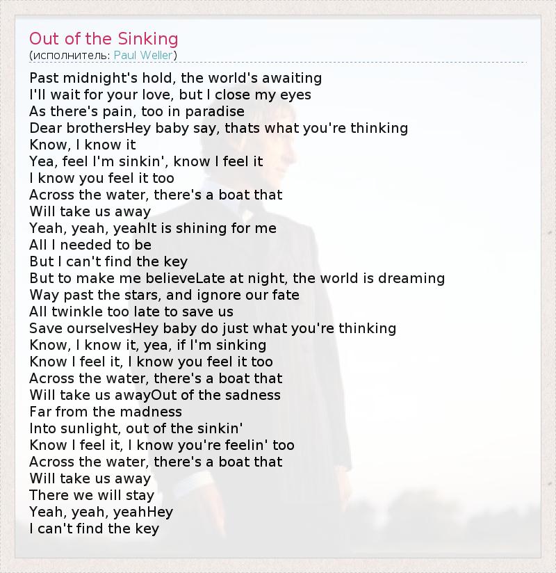 Past midnight's hold, the world's awaiting I'll wait for your love, but I close my eyes As there's pain, too in paradise Dear brothersHey baby say, thats what you're thinking Know, I know it Yea, feel I'm sinkin', know I feel it I know you feel it too Across the water, there's a boat that Will take us away Yeah, yeah, yeahIt is shining for me All I needed to be But I can't find the key But to make me believeLate at night, the world is dreaming Way past the stars, and ignore our fate All twinkle too late to save us Save ourselvesHey baby do just what you're thinking Know, I know it, yea, if I'm sinking Know I feel it, I know you feel it too Across the water, there's a boat that Will take us awayOut of the sadness Far from the madness Into sunlight, out of the sinkin' Know I feel it, I know you're feelin' too Across the water, there's a boat that Will take us away There we will stay Yeah, yeah, yeahHey I can't find the key