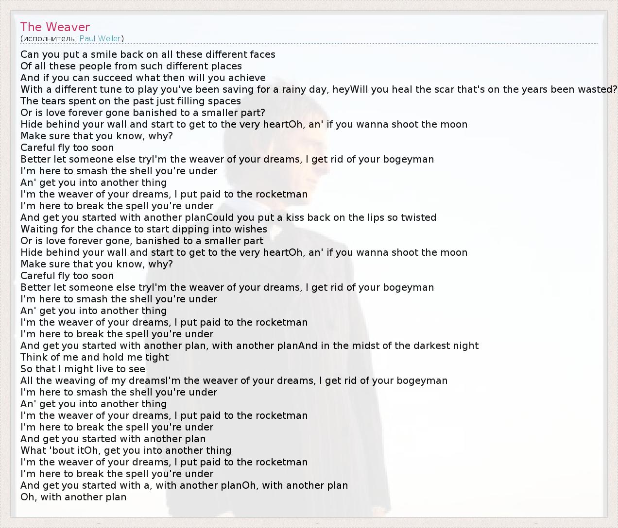 Better let someone else tryI'm the weaver of your dreams, I get rid of your bogeyman
