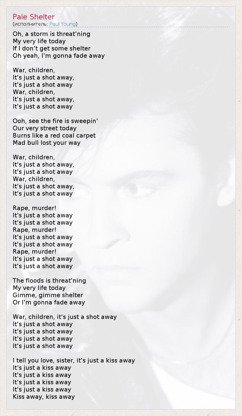 Oh, a storm is threat'ning My very life today If I don't get some shelter Oh yeah, I'm gonna fade away War, children, It's just a shot away, It's just a shot away War, children, It's just a shot away, It's just a shot away Ooh, see the fire is sweepin' Our very street today Burns like a red coal carpet Mad bull lost your way War, children, It's just a shot away, It's just a shot away War, children, It's just a shot away, It's just a shot away Rape, murder! It's just a shot away It's just a shot away Rape, murder! It's just a shot away It's just a shot away Rape, murder! It's just a shot away It's just a shot away The floods is threat'ning My very life today Gimme, gimme shelter Or I'm gonna fade away War, children, it's just a shot away It's just a shot away It's just a shot away It's just a shot away It's just a shot away I tell you love, sister, it's just a kiss away It's just a kiss away It's just a kiss away It's just a kiss away It's just a kiss away Kiss away, kiss away