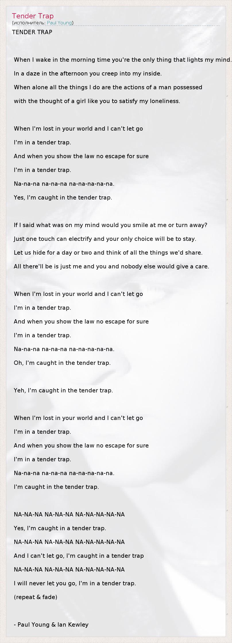 TENDER TRAP When I wake in the morning time you're the only thing that lights my mind. In a daze in the afternoon you creep into my inside. When alone all the things I do are the actions of a man possessed with the thought of a girl like you to satisfy my loneliness. When I'm lost in your world and I can't let go I'm in a tender trap. And when you show the law no escape for sure I'm in a tender trap. Na-na-na na-na-na na-na-na-na-na. Yes, I'm caught in the tender trap. If I said what was on my mind would you smile at me or turn away? Just one touch can electrify and your only choice will be to stay. Let us hide for a day or two and think of all the things we'd share. All there'll be is just me and you and nobody else would give a care. When I'm lost in your world and I can't let go I'm in a tender trap. And when you show the law no escape for sure I'm in a tender trap. Na-na-na na-na-na na-na-na-na-na. Oh, I'm caught in the tender trap. Yeh, I'm caught in the tender trap. When I'm lost in your world and I can't let go I'm in a tender trap. And when you show the law no escape for sure I'm in a tender trap. Na-na-na na-na-na na-na-na-na-na. I'm caught in the tender trap. NA-NA-NA NA-NA-NA NA-NA-NA-NA-NA Yes, I'm caught in a tender trap. NA-NA-NA NA-NA-NA NA-NA-NA-NA-NA And I can't let go, I'm caught in a tender trap NA-NA-NA NA-NA-NA NA-NA-NA-NA-NA I will never let you go, I'm in a tender trap. (repeat & fade) - Paul Young & Ian Kewley