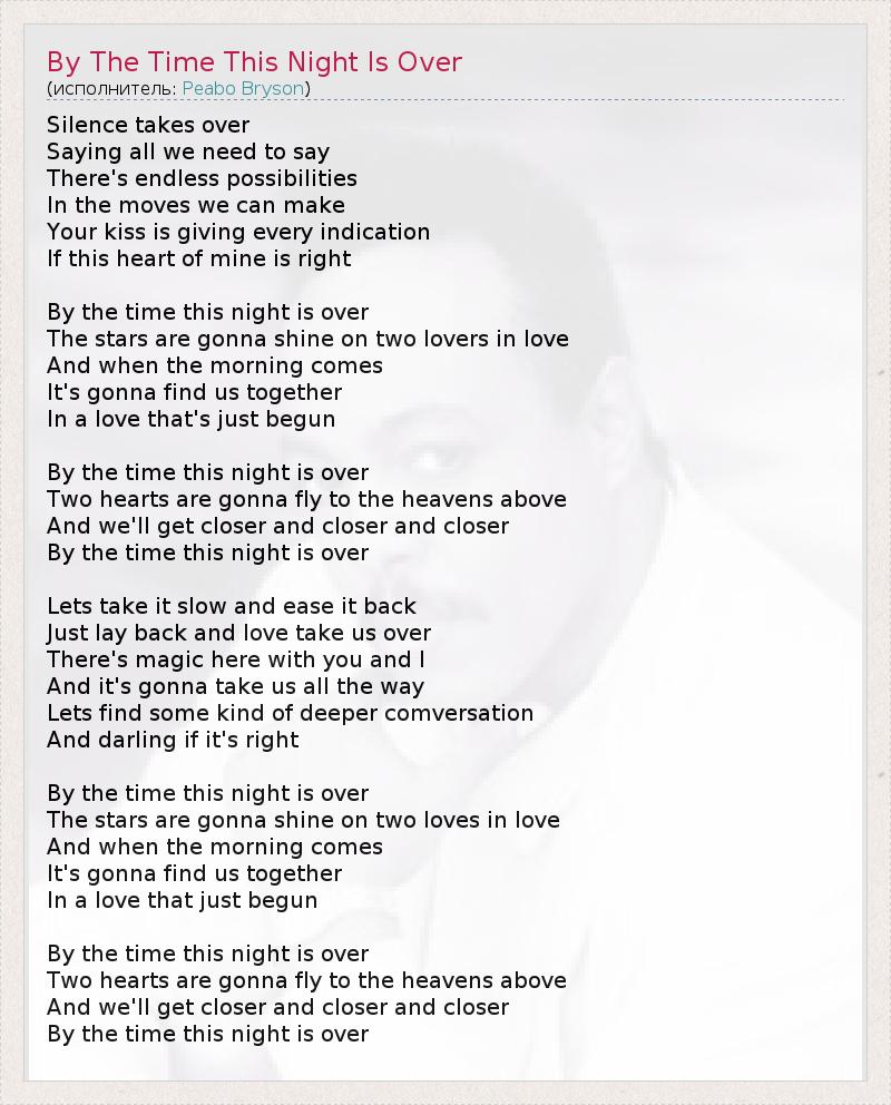 Silence takes over Saying all we need to say There's endless possibilities In the moves we can make Your kiss is giving every indication If this heart of mine is right By the time this night is over The stars are gonna shine on two lovers in love And when the morning comes It's gonna find us together In a love that's just begun By the time this night is over Two hearts are gonna fly to the heavens above And we'll get closer and closer and closer By the time this night is over Lets take it slow and ease it back Just lay back and love take us over There's magic here with you and I And it's gonna take us all the way Lets find some kind of deeper comversation And darling if it's right By the time this night is over The stars are gonna shine on two loves in love And when the morning comes It's gonna find us together In a love that just begun By the time this night is over Two hearts are gonna fly to the heavens above And we'll get closer and closer and closer By the time this night is over